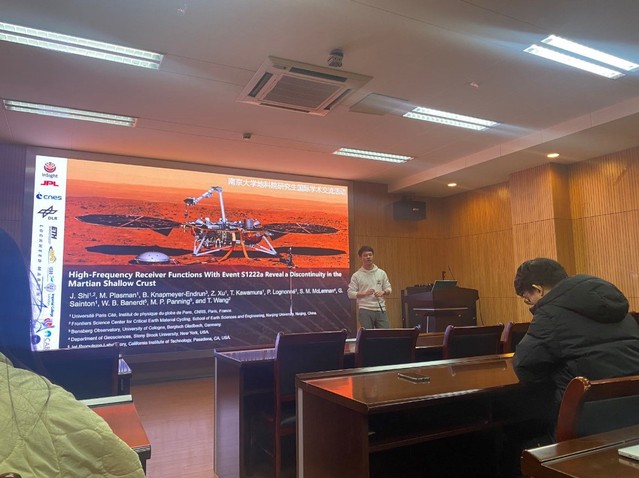 2020级博士研究生石静同学以“High-Frequency Receiver Functions With Event S1222a Reveal a Discontinuity in the Martian Shallow Crust”为题汇报了他在法国巴黎地球物理研究所留学期间的科研进展。他围绕火星地球物理研究,向大家讲述了研究背景、方法创新和论文撰写与投稿的经历。之后,他分享了自己的科研心得,一是要学会独立思考,自主科研;二是要利用一切资源积极主动学习;三是要学会合作,多与文章作者、身边相关领域的同学交流;四是要保持平常心,课余时间培养自己的兴趣和爱好。