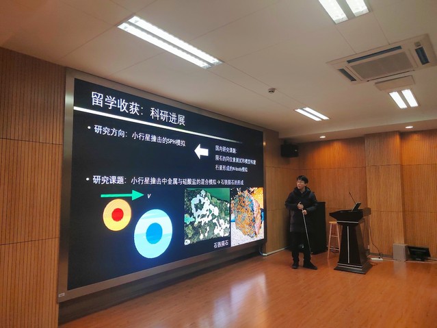 2018级博士研究生帅康同学以“一次跨学科的博士生联合培养经历”为题,向大家汇报了他在德国图宾根大学天文与天体物理研究所留学期间的生活与科研情况。帅康同学介绍了德国图宾根地区的风土人情以及图宾根大学的校园风景,与大家分享了异域生活的点滴。随后他向同学们汇报了关于小行星撞击SPH模拟的研究进展,分享了出国留学的科研方向和课题组的选择经验,联合培养的要求以及国外学术氛围等。他告诉大家,通过联合培养可以学习新的研究方法、实验技能,接触交叉学科知识,并体验不同的科研氛围。