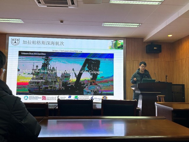 2018级直博生王茂宇在英国布里斯托大学交流学习了一年半,主要研究方向为“微区铀系年代与稳定同位素对晚第四纪冷泉碳酸盐形成机制的约束”。他从甲烷与冷泉的概念切入,介绍了冷泉研究的主要进展,包括触发冷泉活动的机制,冷泉碳酸盐定年的复杂性,冷泉碳酸盐地球化学示踪指标的多解性等。最后,他分享了参加加拉帕格斯深海航次与乘坐深潜器进入深海的经历,认为在海外交流期间应抓住机会积极参与国际交流与科考活动。