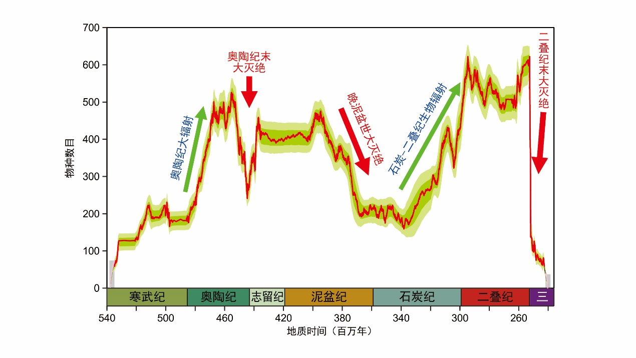 除了生物演化规律与一些“小欢喜”,沈院士还分享了科学最新的“大发现”。2020年沈树忠院士与樊隽轩教授的研究团队,与国内外多家单位合作,通过3112个中国的地层剖面,11,268个海洋化石的数据,凭借自主研发的算法和天河2号超级计算机探索出了第一条高精度的地球古生代3亿年间海洋生物多样性的曲线。该曲线的时间分辨率比同类研究提高了400倍,更为详尽的揭示出了地球生命历史中生物大灭绝与大辐射事件。该项成果也入选了2020年度中国十大科学进展。