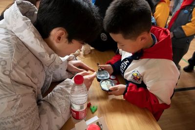 罗盘是野外地质工作的“三大法宝”之一。志愿者为小朋友们讲解了地质罗盘的基本结构,如磁针、刻度盘、水准器等,并以平板代替岩层向同学们演示了罗盘的基本使用方法,如目的物方位测量、岩层走向、倾向和倾角的测量。小朋友们兴趣盎然,踊跃尝试,拿着罗盘爱不释手,对罗盘有了充分的认识。