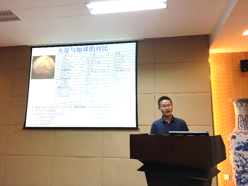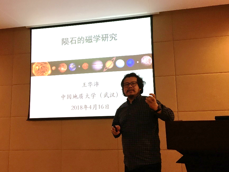 下半场的第一个报告来自于胡森研究员。他的报告题目是《火星陨石与火星古环境演化》。胡森老师首先介绍了火星的基本特征和火星陨石的分类,然后介绍了火星水及氢同位素的研究对限定火星古环境演化的重要意义,接着从火星内部有多少水,如何演化以及与古环境的关系来介绍了他们课题组最近几年对于火星陨石的研究成果及未来的研究计划。惠鹤九教授的报告题目是《月球火山玻璃珠的冷却速率》。惠老师首先介绍了为什么要研究火山玻璃珠的冷却速率以及阿波罗时代国际上对玻璃珠成因的争论,然后从分离玻璃珠样品开始介绍了使用热容测量来研究月球火山玻璃珠的过程及取得的重要结论。最后,张爱铖教授的报告题目是《太阳星云高温过程的陨石制约》。他首先介绍了陨石的分类、球粒陨石的组成及与太阳星云高温过程的关系,然后向与会师生汇报了其对特殊Angrite岩屑的观察结果和初步结论。