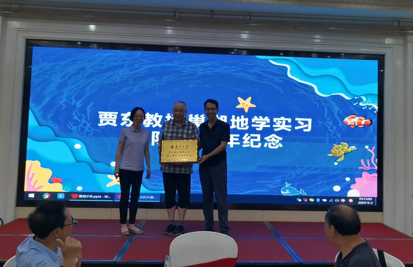 晚会最后,大家还为在巢湖带队实习了整整二十五年的贾东教授准备了惊喜,董婷书记和王博院长一起为这位兢兢业业守在一线的学者献上了纪念奖牌,大家共同举杯为他庆祝。随后,王博院长为贾东老师献上了最有诚意的祝福和感谢。