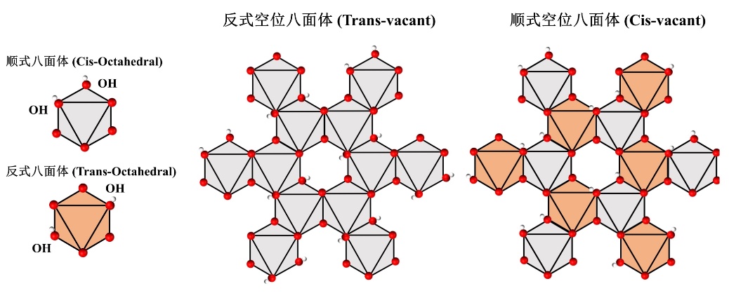 图1. 蒙脱石矿物的反式空位和顺式空位八面体层结构。