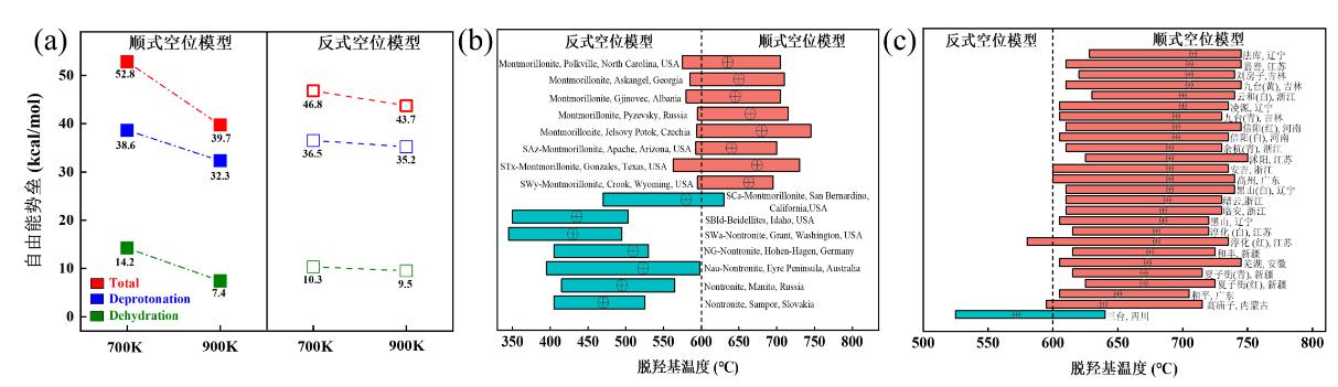 图2. (a) cv和tv蒙脱石热反应的自由能垒;(b) 欧洲和美国不同地区粘土的脱羟基温度范围和峰值以及cv/tv类型区分;(c) 中国不同地区粘土的脱羟基温度范围和峰值以及cv/tv类型区分。