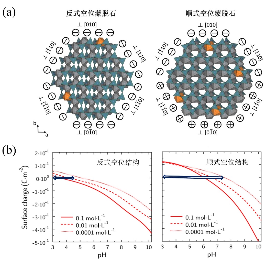 图3. (a) cv和tv蒙脱石在中性pH时不同晶面取向的带电示意图;(b) cv和tv蒙脱石在不同pH和离子强度条件下总的界面电荷。