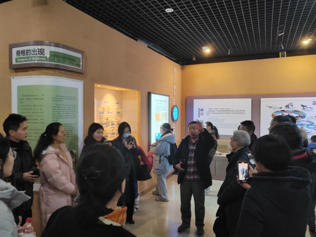 论坛结束后,在古脊椎所校友朱敏(小,与院士同名)的带领下,校友们参观了中国古动物馆。他用生动的语言,让母校领导和北京校友从实物化石的角度,让校友们在听报告的基础上,又在视觉上直观地认识到了脊椎动物从鱼类(海口鱼)演化到人类的复杂演化历程。