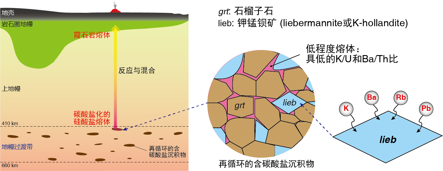 研究发现这些霞石岩与该区岩石圈地幔(以地幔橄榄岩捕虏体为代表)具有完全不同的同位素特征,说明岩石圈地幔不是这些霞石岩的源区。其明显偏轻的Mg同位素组成,指示其地幔源区存在含碳酸盐沉积物的显著贡献。霞石岩异常低的K/U和Ba/Th比值需要源区残留富钾矿物。实验岩石学已经证明含碳酸盐沉积物在地幔过渡带的深部熔融过程中,钾锰钡矿(KAlSi3O8;英文名:liebermannite或K-hollandite)是一个稳定的残余高压矿物相,且相比于Th、U和轻稀土,该矿物对K、Ba、Rb和Pb具有更强的相容性(图2)。因此,在这一深度低程度部分熔融释放的熔体就能呈现出霞石岩标志性的微量元素特征,而这些特征也恰恰是霞石岩与金伯利岩相似的那些微量元素特征。也就是说,霞石岩所代表的初始熔体,与金伯利岩一样,都是含碳酸盐物质在地幔过渡带深度低程度熔融的产物。由于源区残留钾锰钡矿这一富钾的高压矿物,造成二者在微量元素上具有高度的相似性。