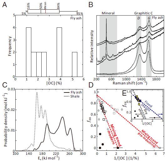 图3:长江流域粉煤灰、页岩、沉积物等样品的地球化学特征。A:粉煤灰有机碳含量频率分布图;B:粉煤灰拉曼光谱图;C:粉煤灰与页岩样品活化能分布图;D:粉煤灰以及其它样品化学氧化系数与有机碳含量关系图。图片来源:Li et al., 2021, PNAS