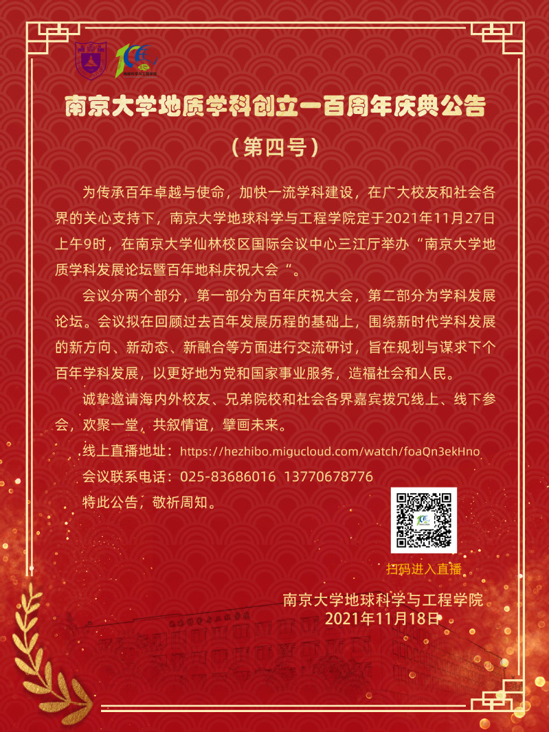 永利304官网唯一地质学科创立一百周年庆典公告(第四号)