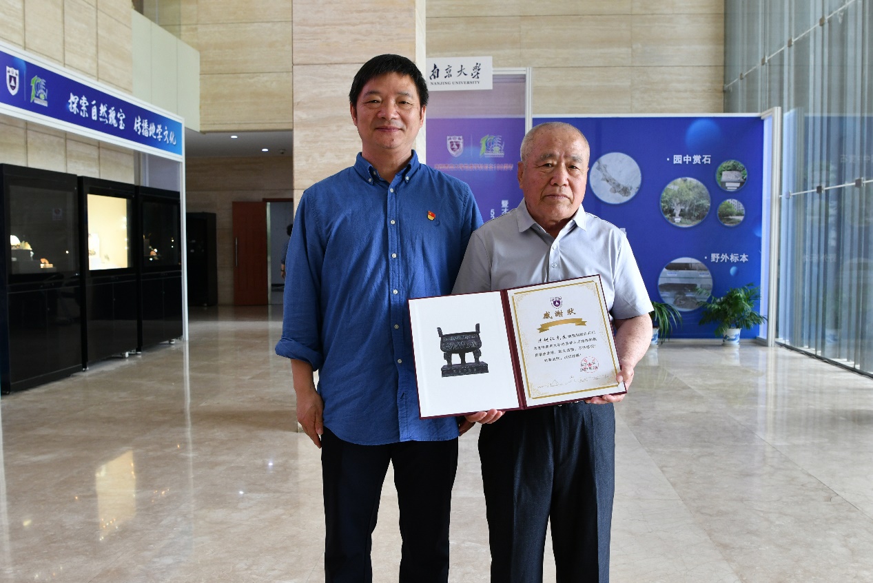 王唯书记为才树仁先生颁发捐赠化石感谢状