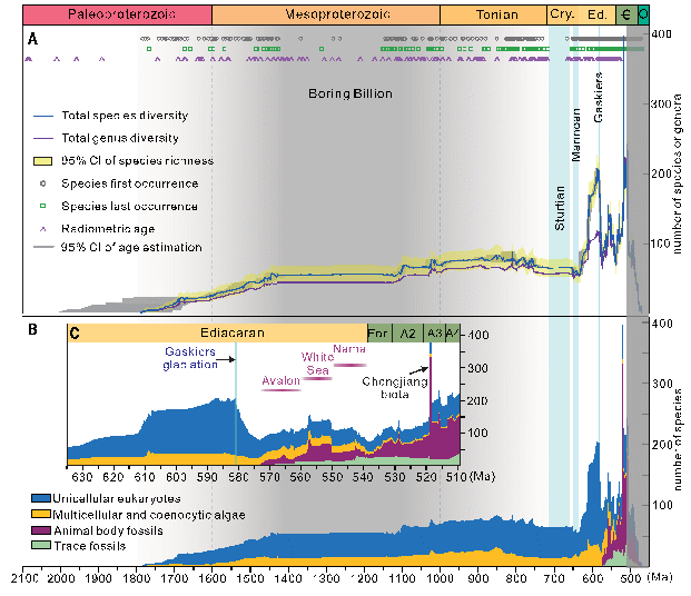 The results indicate that the diversity of eukaryotes maintained a low but stable growth pattern since their earliest unambiguous fossil records in around 1.7 billion years ago. However, this pattern was disrupted by the emergence of a global glaciation event around 720 million years ago. Following the end of the glaciation event, life diversity began to increase rapidly and fluctuate frequently, leading to multiple episodes of major biological radiation and extinction. These include a significant biological radiation event between approximately 635 and 580 million years ago, followed by the first mass extinction event in life history, which results in the sharp disappearance of the dominant organism--spiny microorganisms. Following this mass extinction, more complex macroscopic organisms, including animals, underwent rapid radiation. However, these complex macroscopic organisms encountered two significant declines in diversity at the end of the Ediacaran Period (approximately 551 to 539 Ma), marking the earliest two mass extinction events in the evolutionary history of animals.
