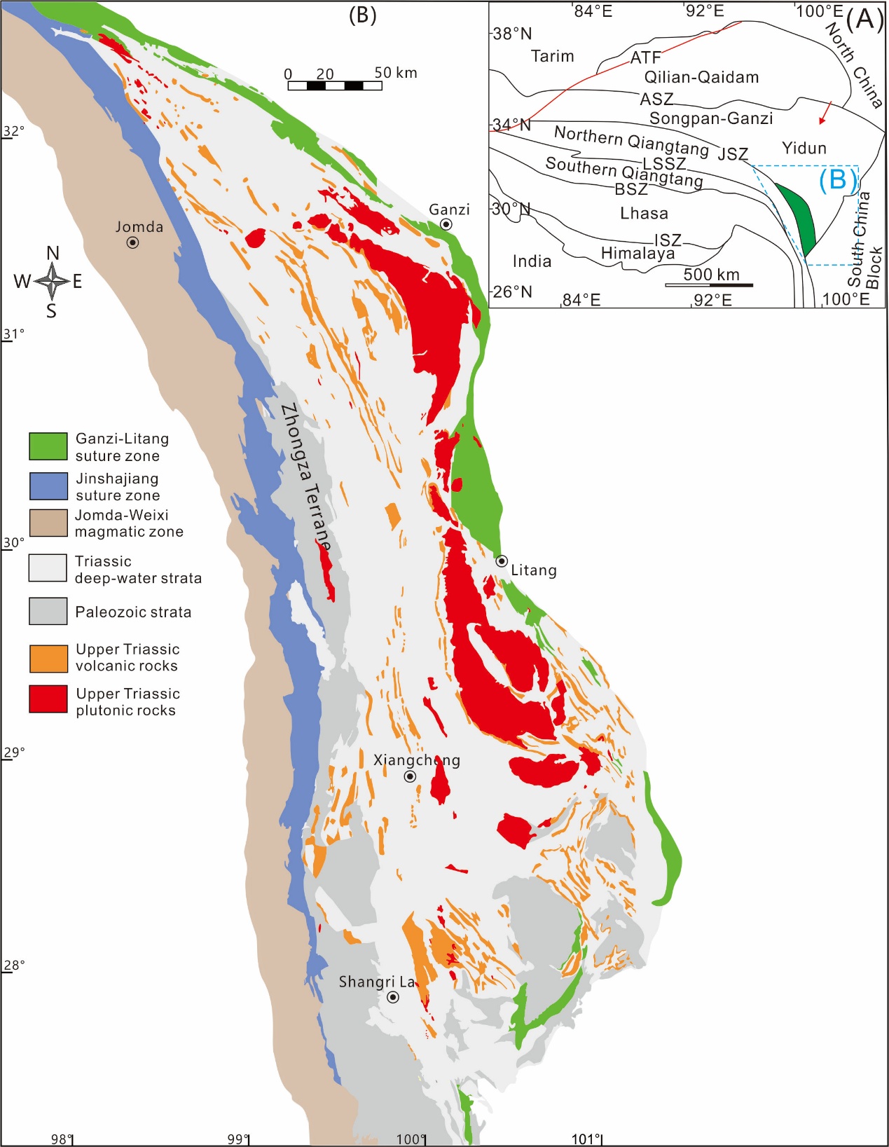 Figure 1. Geological sketch map of the Ganzi-Litang area in the eastern Tibetan Plateau, with the Yidun magmatic rocks highlighted in red.
