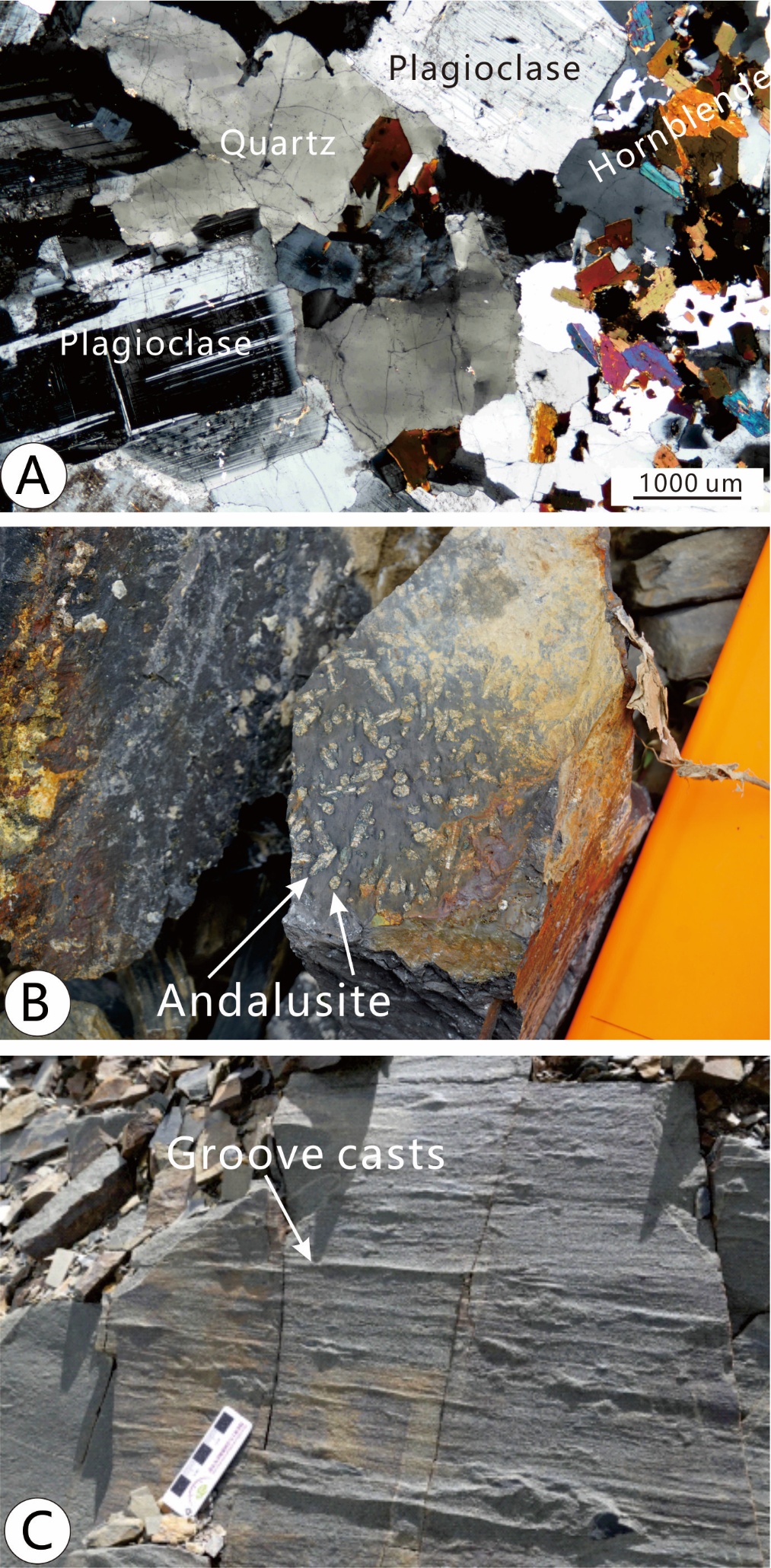 Figure 3. (A) Typical photomicrographs of the Yidun magmatic rocks; (B)Andalusite hornfels formed by intrusive contact between granite and Triassic strata; (C) Sole structures of Triassic turbidites.
