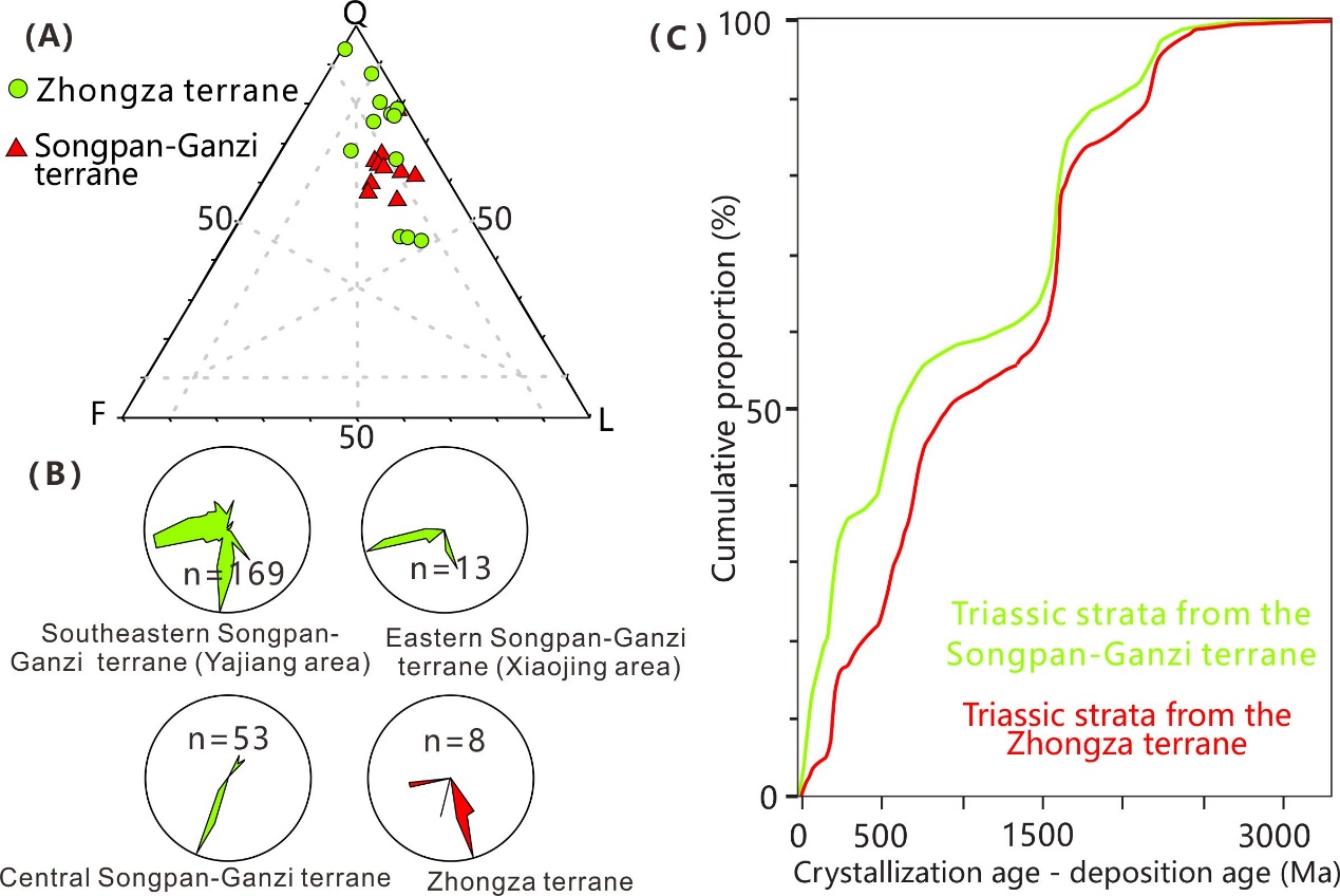 Figure 4. A comparison of Triassic turbidites between the Zhongza and Songpan-Ganzi terranes: QFL (quartz-feldspar-lithic) triangular diagram (A); paleocurrent directions (B); cumulative probability curves of detrital zircon ages (C).