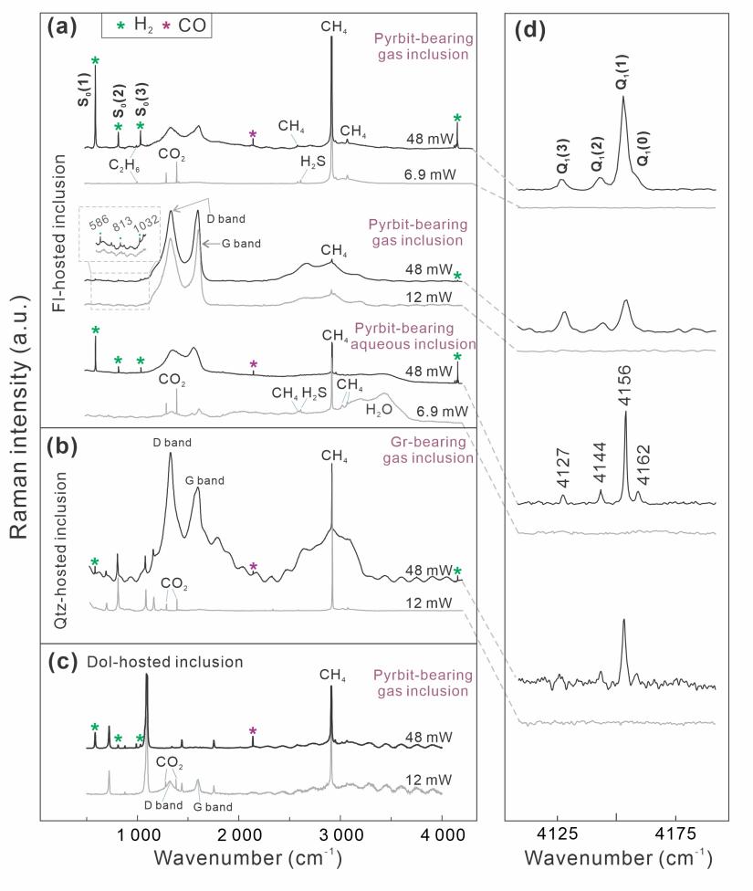 These findings carry an important methodological implication: when Raman spectroscopy is used to characterize inclusion compositions, particularly in samples containing carbonaceous phases, laser power must be carefully controlled, and direct focusing on carbonaceous components should be avoided whenever possible, to minimize the risk of artificial H2 production. By reducing analytical artifacts, inclusion-based measurements can more reliably constrain deep-Earth fluid properties (T-P-x-fO2) and their evolution.