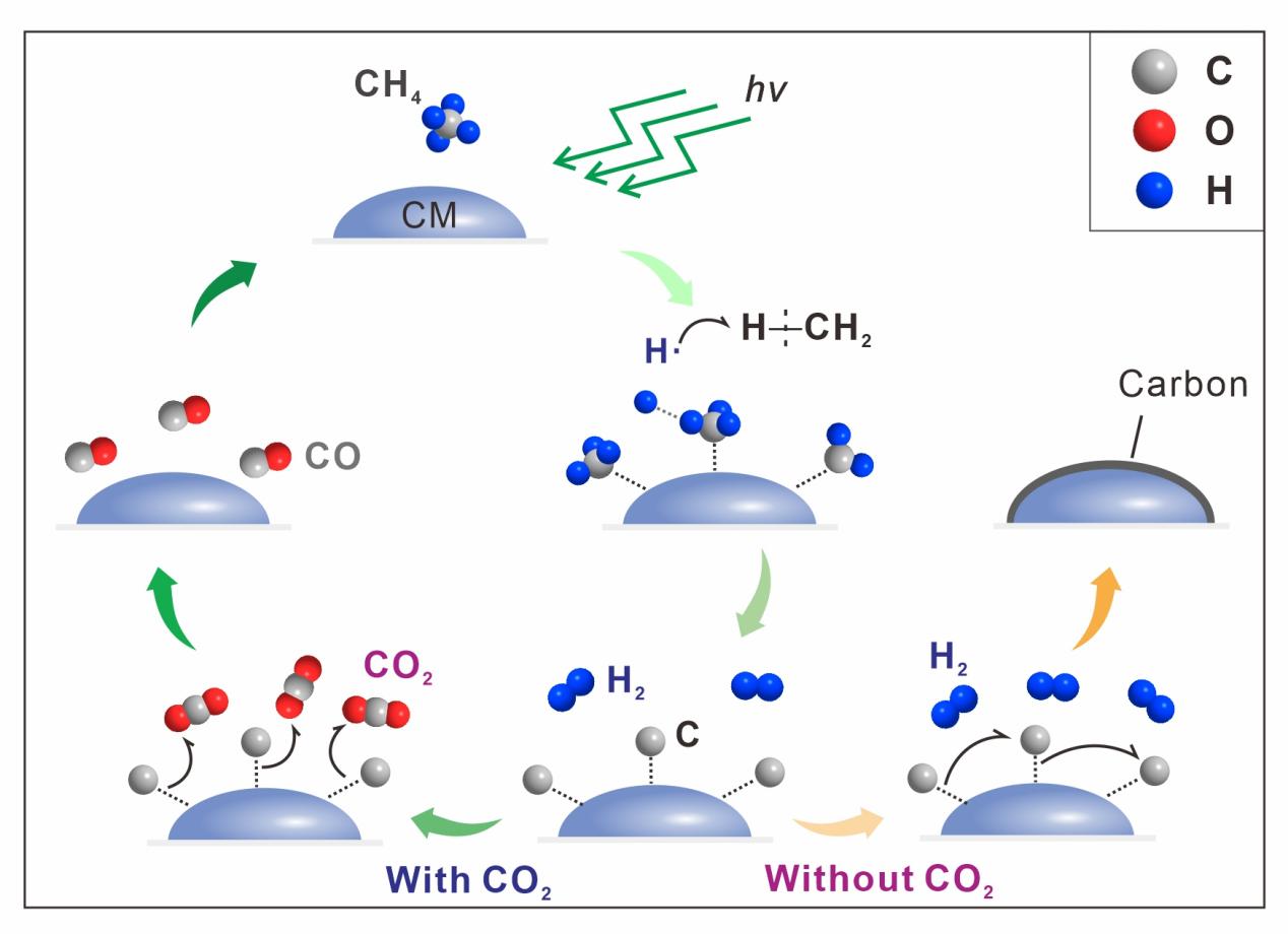 Fig. 4. Pathway of H2 production from CH4 under laser induction and catalysis by carbonaceous materials (CM).