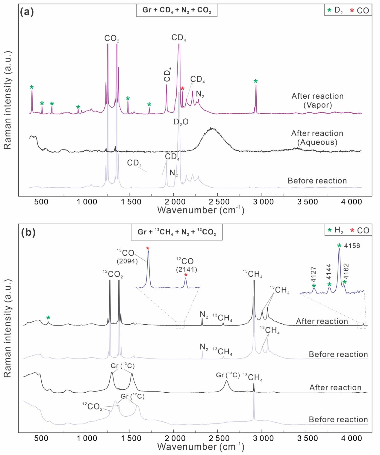 Raman spectroscopy is currently the most effective technique for identifying H2 in individual inclusions. Professor Xiaolin Wang’s team conducted systematic in situ Raman analyses of natural inclusions hosted by quartz, dolomite, and fluorite, together with synthetic inclusions prepared as fused silica capillary capsules (FSCCs) (Fig. 1). A key observation emerged across these systems: under laser irradiation, carbonaceous materials (CMs) (e.g., graphite, pyrobitumen, and diamond) can catalyze methane (CH4) decomposition and generate Raman-detectable H2 within seconds to tens of seconds (Fig. 2). When CO2 is present, carbon monoxide (CO) is also produced. Isotopic substitution experiments provide decisive evidence for the source of hydrogen: CD4 yields D2 rather than H2, confirming that hydrogen is derived from methane decomposition (Fig. 3). In 13CH4-bearing systems, 13C-graphite can be detected, indicating that graphite is the terminal carbon product of CH4 decomposition. Moreover, the newly formed 13C can react with 12CO2 to produce both 13CO and 12CO (Fig. 3), revealing coupled carbon-oxygen exchange pathways during irradiation.