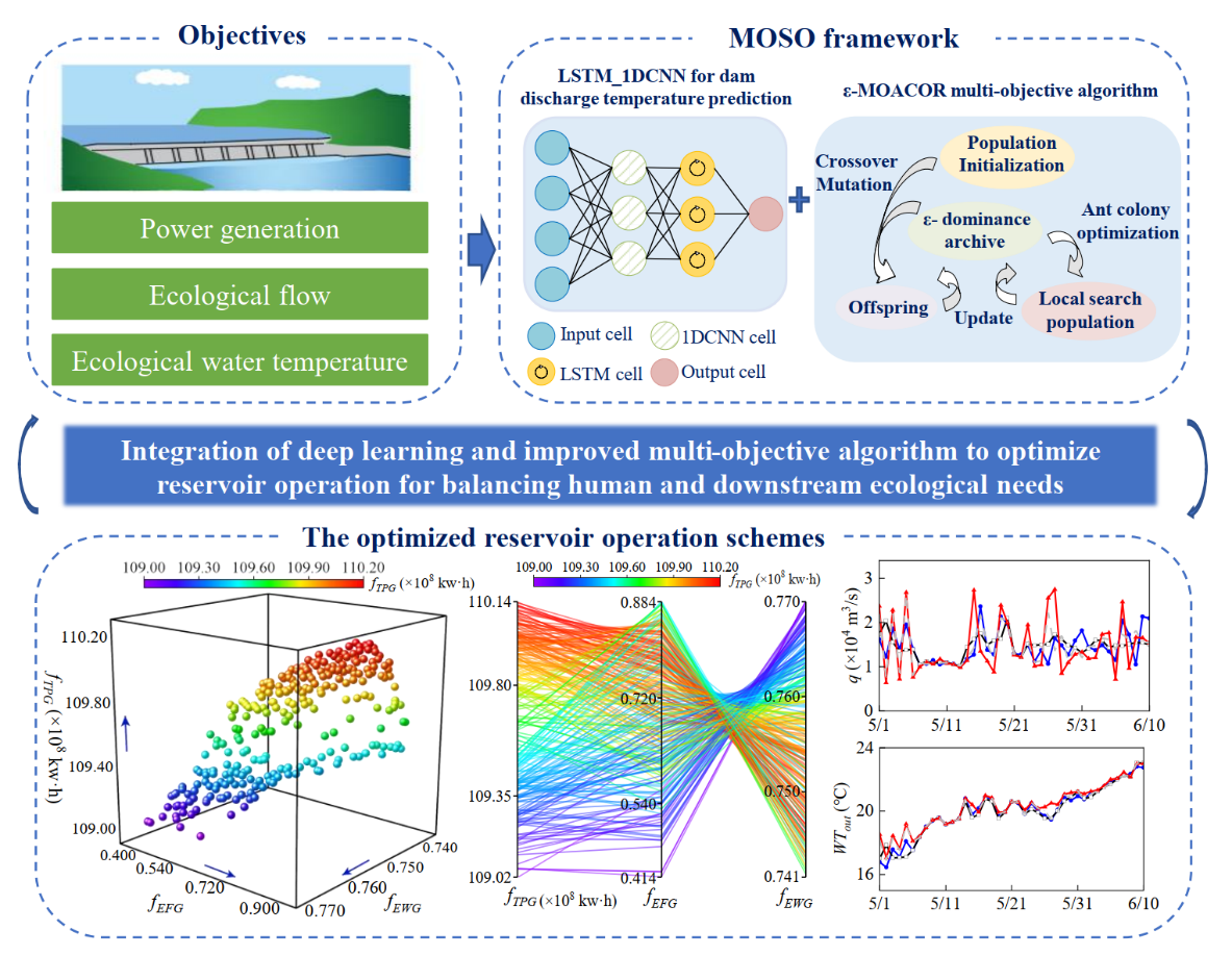 The team of Professor Dong Wang and Professor Jichun Wu, from the School of Earth Sciences and Engineering, Nanjing University, made a series of substantial progress in reservoir ecological optimization operation and management based on deep learning algorithms. The findings are as follows: (1) The water temperature prediction model based on artificial intelligence algorithms predicts river water temperature efficiently and reliably; (2) The deep learning-based evaluation method quantitatively separates the impacts of the Three Gorges Reservoir and climate change on the water temperature at Yichang in the middle reach of the Yangtze River when the data is limited; (3) By coupling with the two-dimensional hydrodynamic water temperature model and the suitability model, the habitat simulation method effectively calculates the suitable ecological flow and ecological water temperature for the Four Major Chinese Carps spawning in the middle reach of the Yangtze River; (4) By integrating deep learning algorithm with improved multi-objective evolutionary algorithm, the multi-objective simulation-optimization method efficiently optimizes the complex reservoir operation. The optimal management schemes of dam discharge volume and dam discharge temperature are proposed for the Three Gorges reservoir to comprehensively balance the economic and downstream ecological benefits. The above studies provide new thoughts and methods to reservoir ecological operation and optimal management.