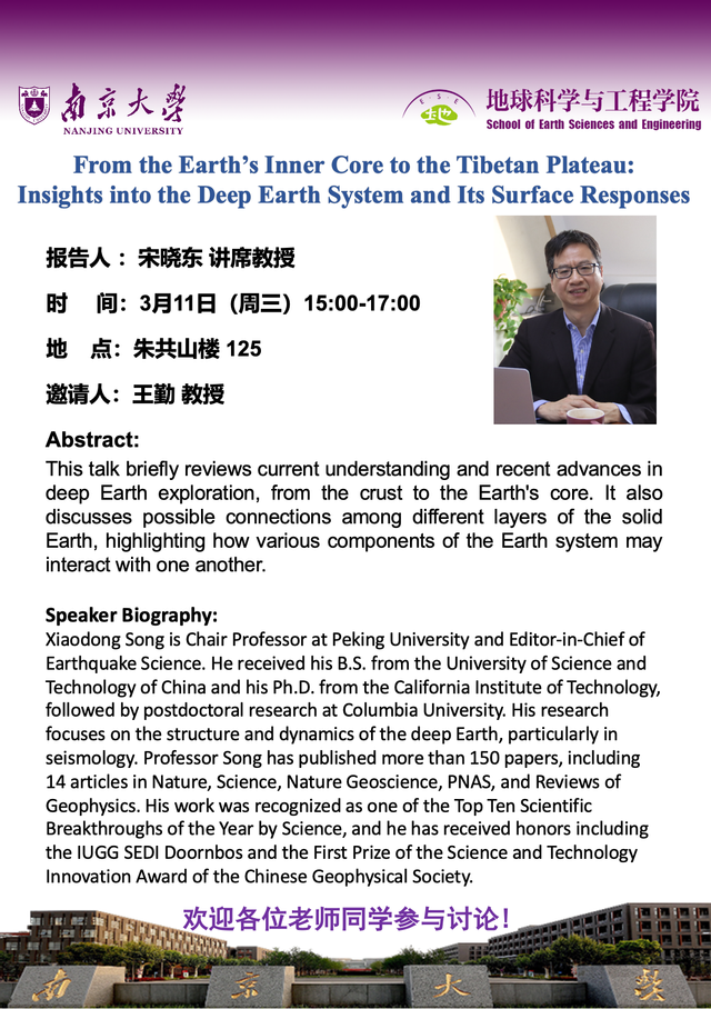 Lecture: From the Earth’s Inner Core to the Tibetan Plateau: Insights into the Deep Earth System and Its Surface Responses