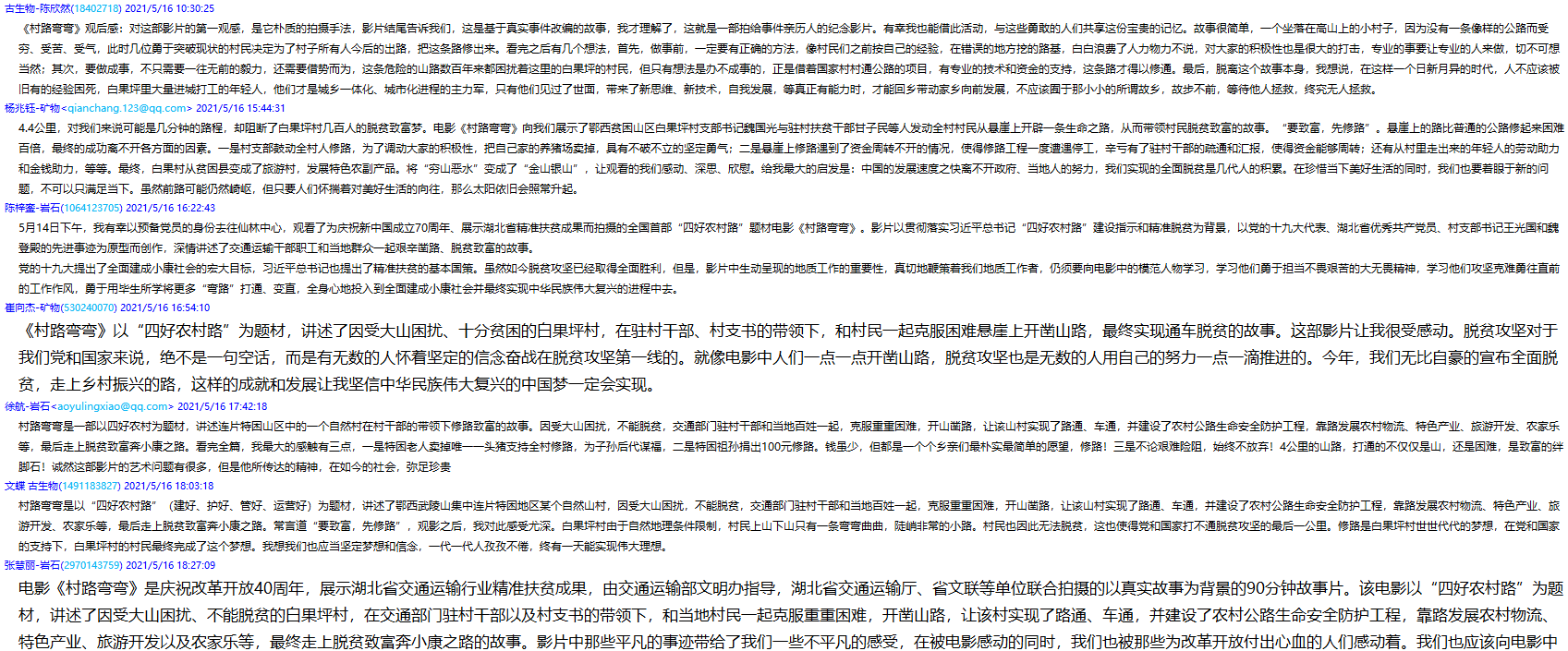 博士生二支部徐航:我最大的感触有三点,一是特困老人卖掉唯一一头猪支持全村修路,为子孙后代谋福,二是特困祖孙捐出100元修路。钱虽少,但都是一个个乡亲们最朴实最简单的愿望,修路!三是不论艰难险阻,始终不放弃!4公里的山路,打通的不仅仅是山,还是困难,是致富的绊脚石!这部影片……传达的精神,在如今的社会,弥足珍贵!