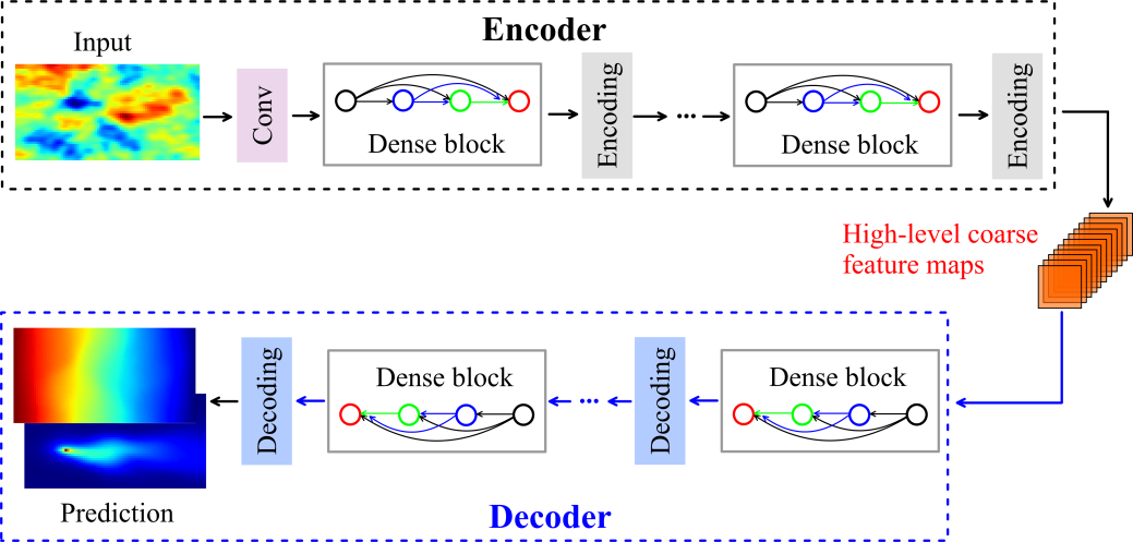永利官网吴吉春教授和施小清教授团队与美国圣母大学Nicholas Zabaras教授合作,提出了一种深度卷积编码-解码网络(deep convolutional encoder-decoder network)方法来构建深度神经网络替代模型(surrogate model)。与传统机器学习方法不同,该方法创新地将非均质介质场和模型响应输出场作为图像,利用卷积神经网络强大的图像数据处理能力去解决“维度约束”问题,进而通过替代模型显著地节约计算消耗。通过求解一个参数维高达2500维的CO2地质封存多相流模型不确定性分析问题以及一个686维的地下水污染源识别问题验证了所提出方法的有效性和稳健性,该方法能够精确高效地刻画地下水多相流模型和污染物运移模型的高维输入-输出场的函数关系,有效地解决了“维度约束”这一瓶颈。