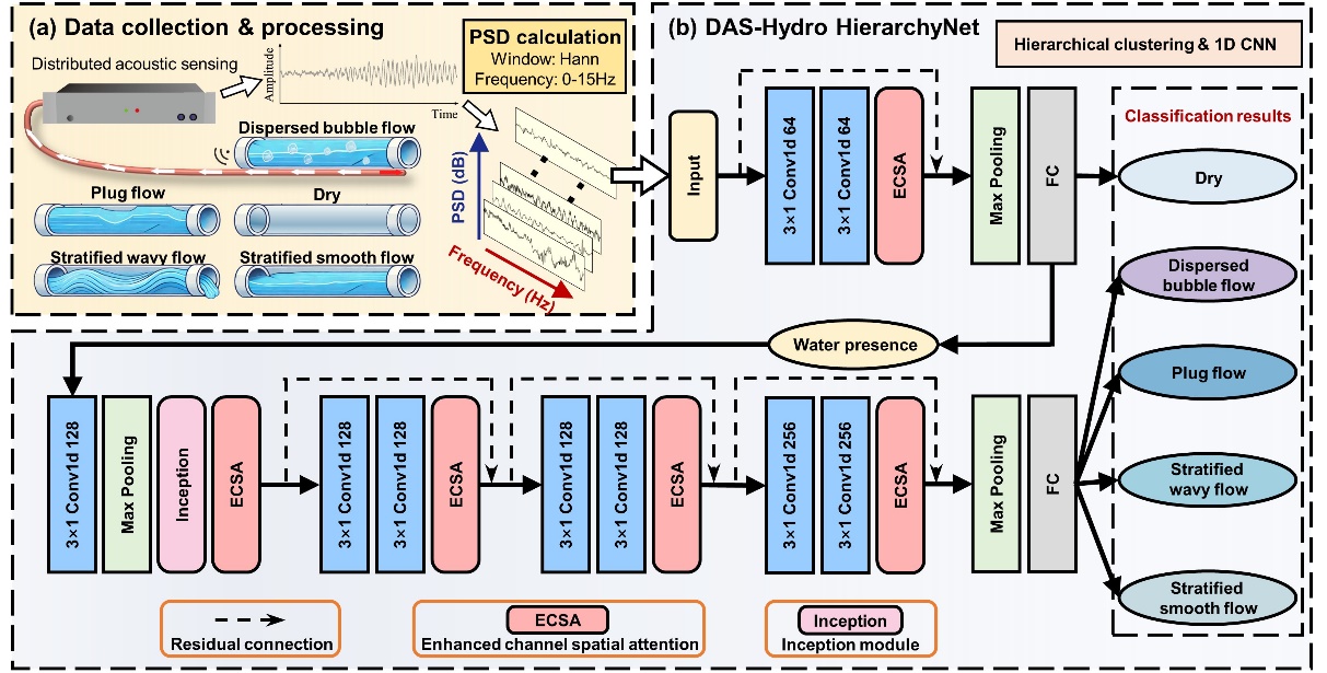 面对这一关乎国计民生的重大挑战,永利304官网唯一朱鸿鹄教授、谭道远副教授团队联合香港理工大学、香港城市大学、中山大学等知名高校,依托分布式光纤声波振动传感(DAS)技术,对地下输水隧洞流态识别这一世界级工程难题开展了深入研究。团队以国家重大水利工程、国家水网骨干工程——珠江三角洲水资源配置工程为示范点,在工程全线部署了高时空分辨率的光纤在线智能感知系统,首次实现了对输水盾构隧洞关键区域振动信号的精准、实时采集。基于原位监测数据,研究团队创新性地提出了融合分布式声波传感与深度学习算法的水流状态实时监测技术,并构建了名为“DAS-Hydro HierarchyNet”的分层聚类模型,大幅提升了流态识别的智能化和自动化水平。该技术不仅实现了对“气泡流”“塞流”“分层波动流”“分层平稳流”等典型流态的精准识别,还显著增强了对复杂流态变化的动态感知能力。团队进一步运用SHAP方法对模型的决策过程进行频谱解释分析,揭示了不同流态与声学频谱特征之间的内在联系。该成果为大型引调水工程运行管理提供了实时、连续、智能的状态感知与风险预警手段,显著提升了该类工程的安全裕度与运维效率,为粤港澳大湾区供水系统的智能化升级提供了坚实的技术支撑,也为全球韧性城市生命线建设贡献了可复制、可推广的“中国方案”。